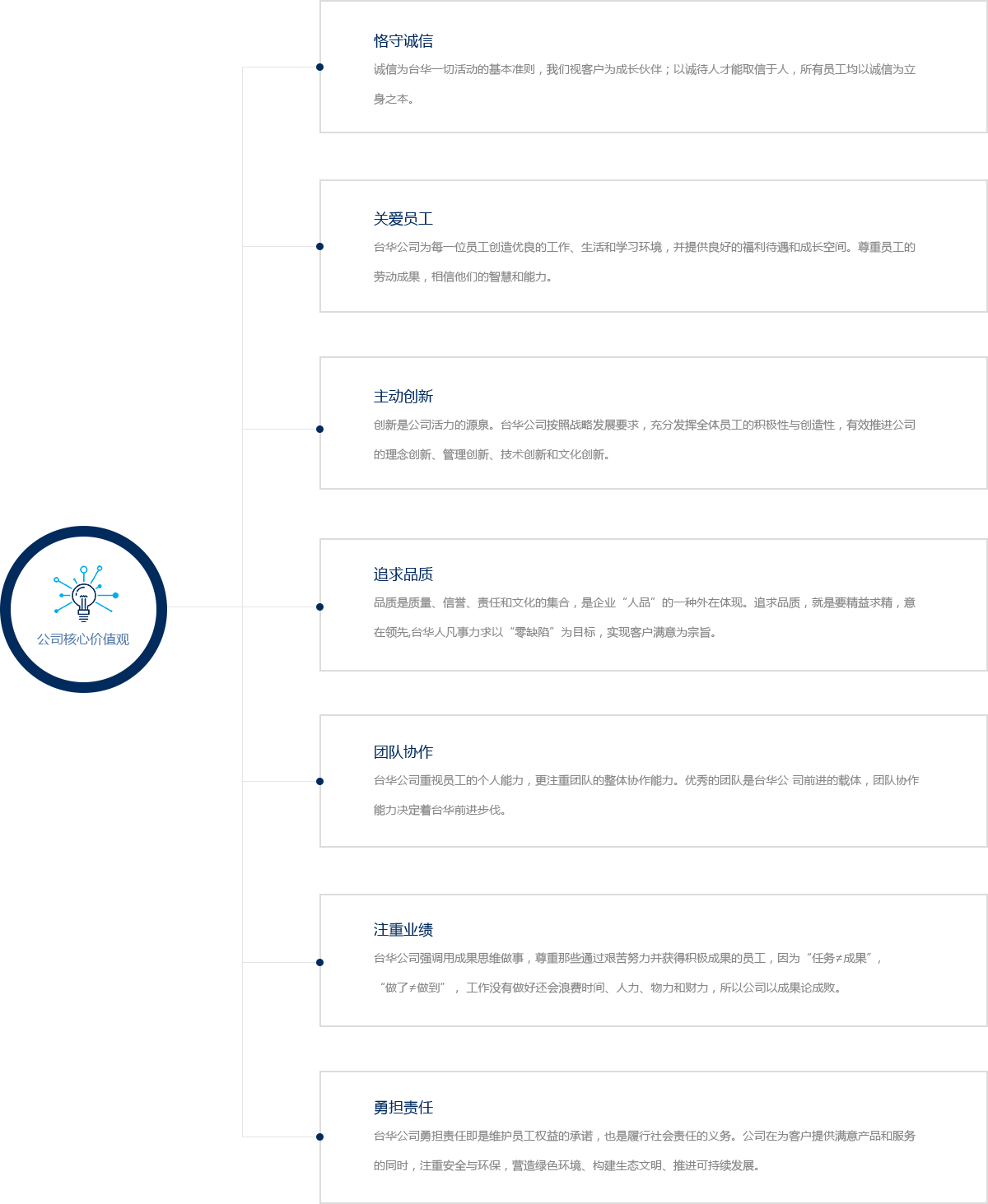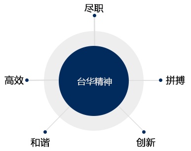 自2001年發(fā)展至今,臺華公司從小到大、從弱到強,臺華人用辛勞的汗水曾澆灌出了“主動、責(zé)任、紀(jì)律、團(tuán)結(jié)”的精 神之花。2014年,為了適應(yīng)公司新的發(fā)展要求,臺華人提出了新企業(yè)精神“盡職、高效、拼搏、和諧、創(chuàng)新”,并編入公司管 理制度及相關(guān)規(guī)范性文件。