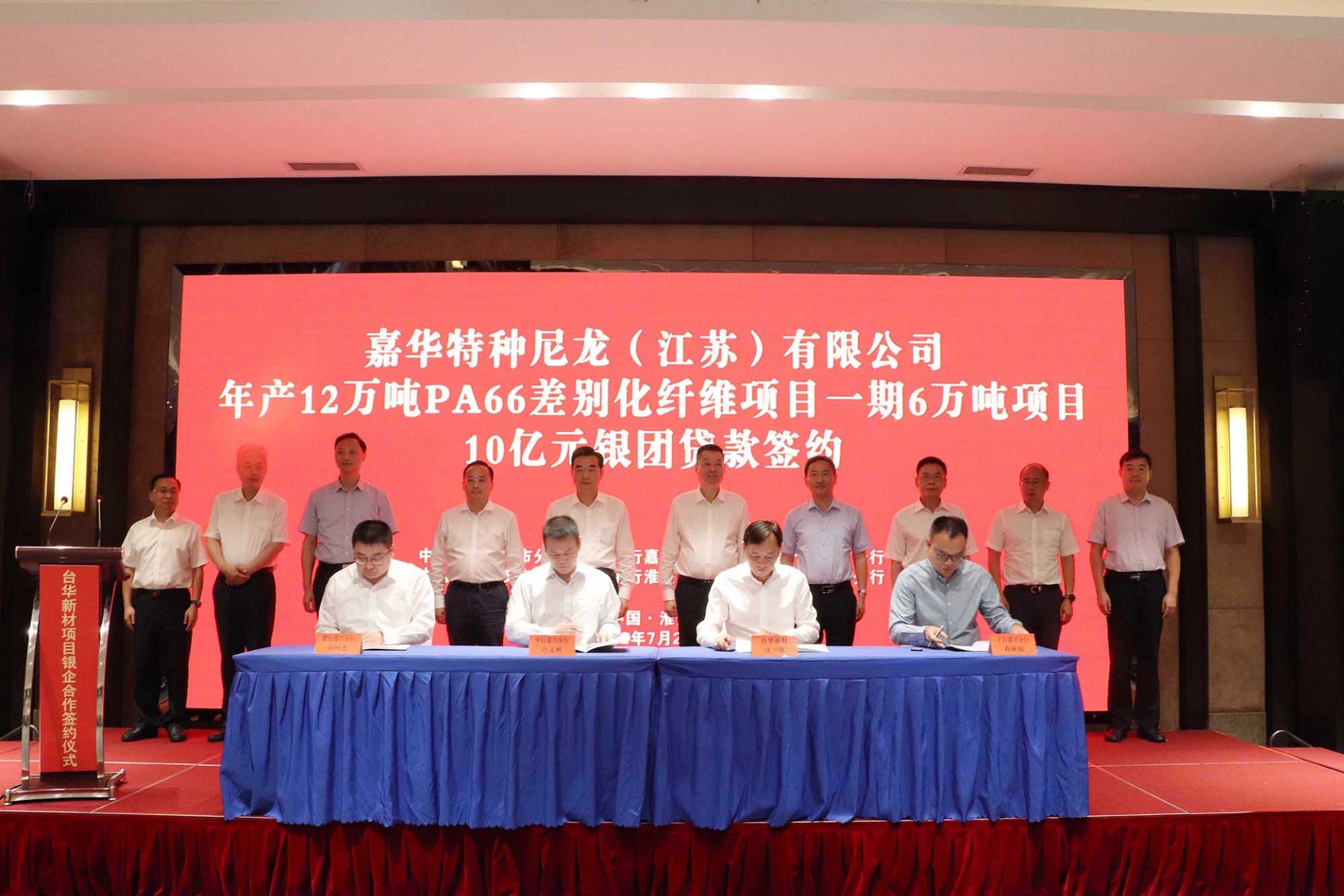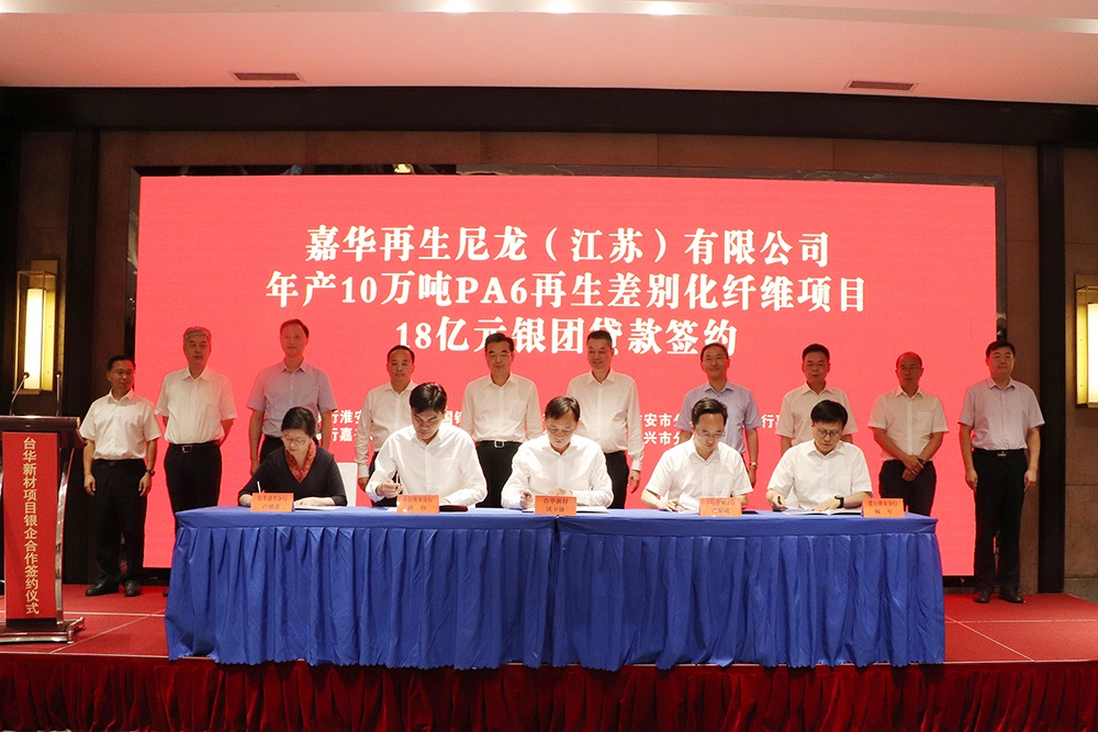7月21日,在江蘇省淮安市,臺華新材與中國銀行、工商銀行、建設銀行、民生銀行等7家金融機構(gòu)組成的銀團簽訂貸款協(xié)議書,總授信金額28億元,支持臺華新材綠色多功能錦綸新材料一體化項目(一期)的建設。