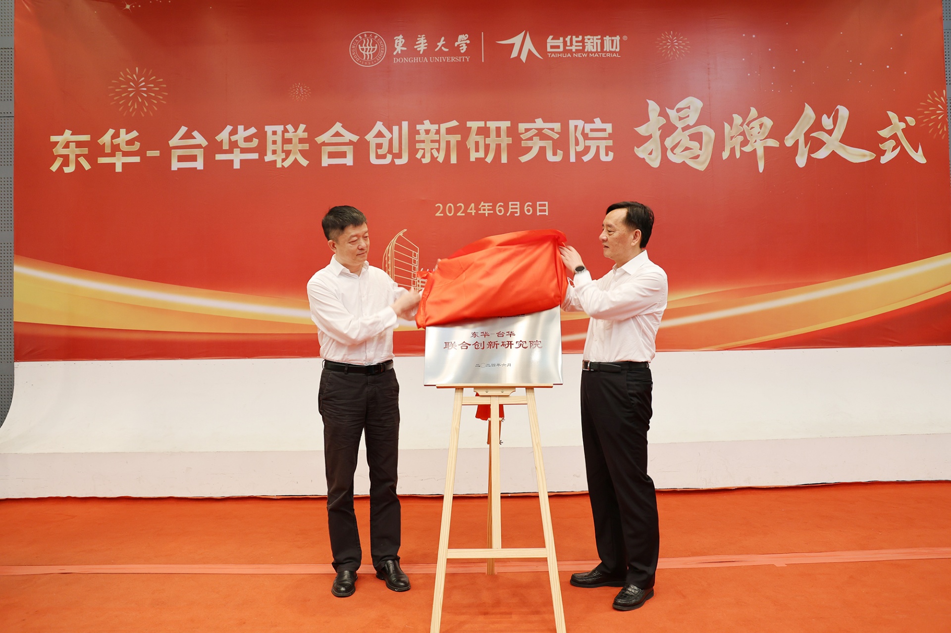 浙江臺華新材料集團股份有限公司代表,東華大學(xué)相關(guān)部門負(fù)責(zé)人、院系代表見證“東華—臺華聯(lián)合創(chuàng)新研究院”揭牌。