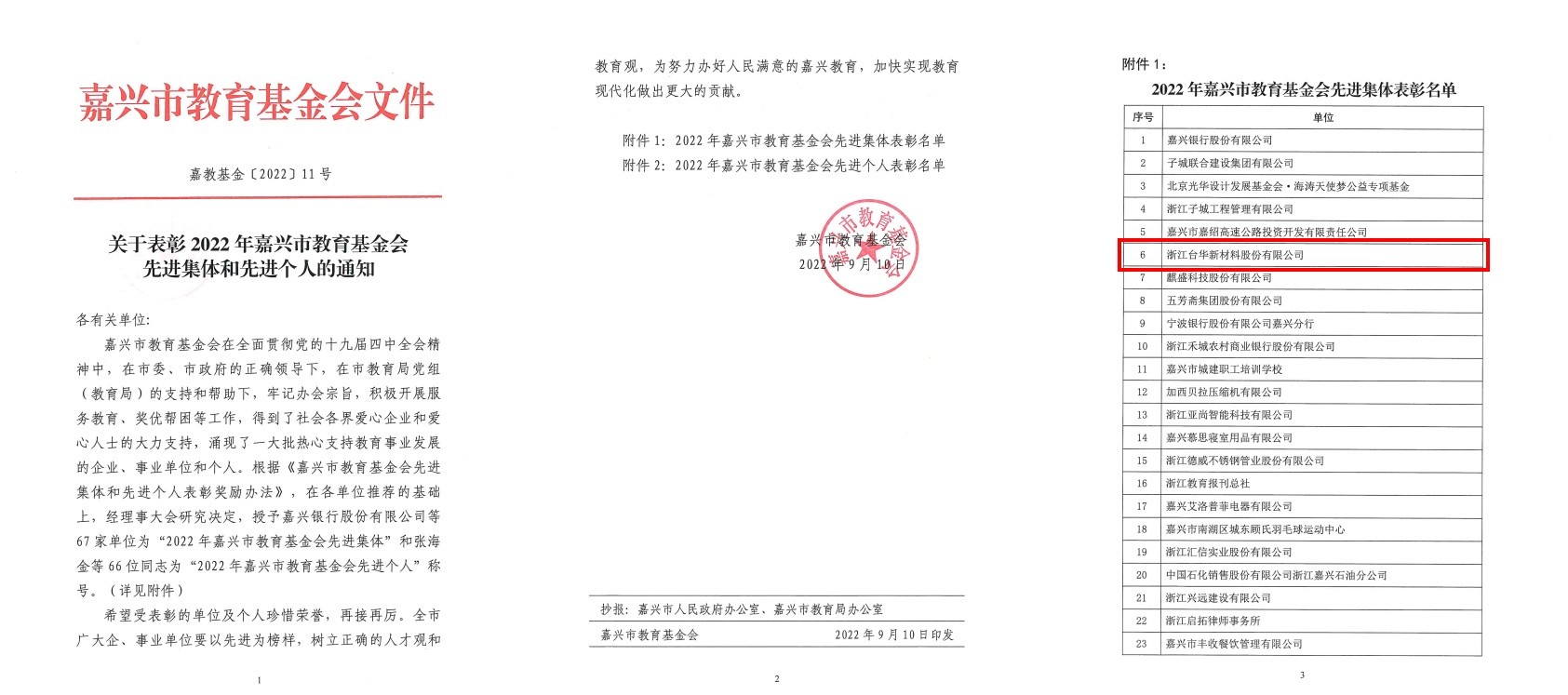 2016年、2021年臺華分別和嘉興市教育基金會(huì)簽訂捐贈(zèng)協(xié)議100萬元,用于獎(jiǎng)勵(lì)當(dāng)?shù)刂行W(xué)德智體美勞全面發(fā)展的優(yōu)秀學(xué)生