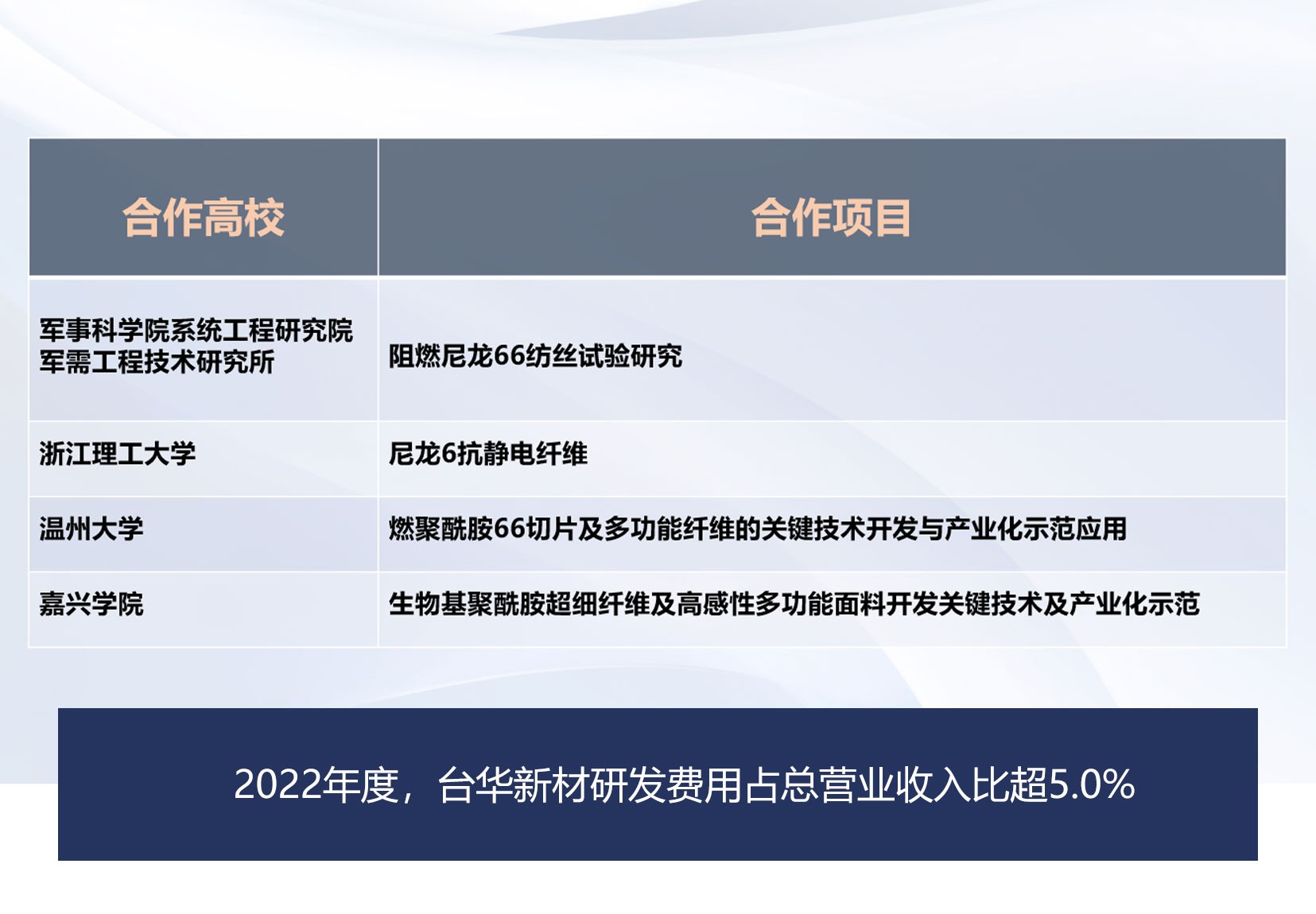 ?公司堅(jiān)持走“產(chǎn)學(xué)研”合作的道路,公司“產(chǎn)學(xué)研”合作優(yōu)勢突出,與東華大學(xué)、浙江理工大學(xué)、長三角 (嘉興)納米科技產(chǎn)業(yè)發(fā)展研究院(國家納米科學(xué)中心嘉興分院)、嘉興大學(xué)等專業(yè)院校、研究所合作, 組成優(yōu)勢互補(bǔ)、產(chǎn)學(xué)研相結(jié)合的攻關(guān)隊(duì)伍,形成信息共享、基礎(chǔ)研究、技術(shù)攻關(guān)、技術(shù)推廣、 產(chǎn)業(yè)化應(yīng)用互相聯(lián)動(dòng)的研發(fā)格局,共同承擔(dān)了多個(gè)項(xiàng)目。與東華大學(xué)、浙江理工大學(xué)、嘉興大學(xué)等形成長期性產(chǎn)學(xué)研合作。與美國杜邦、德國德司達(dá)、美國亨斯曼、德國巴斯夫、日本TMT、津田駒、日本大金、德國 巴馬格、德國門福士、美國3M等業(yè)內(nèi)的專家進(jìn)行技術(shù)交流,開發(fā)高新技術(shù)產(chǎn)品及國際流行產(chǎn)品。